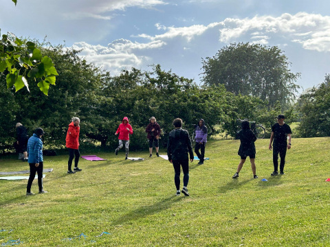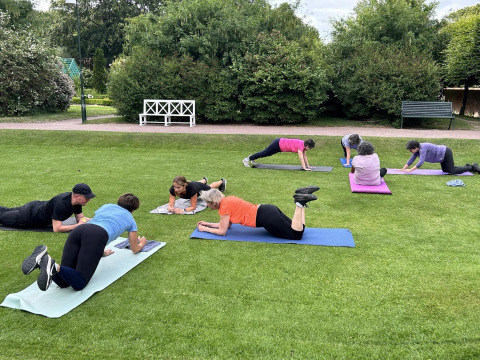Varierad gruppträning utomhus för att förbättra din styrka, kondition, balans och rörlighet.